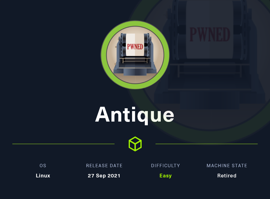 Antique is one of the machines listed in the HTB printer exploitation track. It features a network printer that stores its password in plain text and is readable via SNMP. The password can be used to login into the telnet service, where it allows OS command execution, which can then be abused to gain initial access to the system. There is a CUPS service on this machine that can be exploited to read arbitrary files in the system.