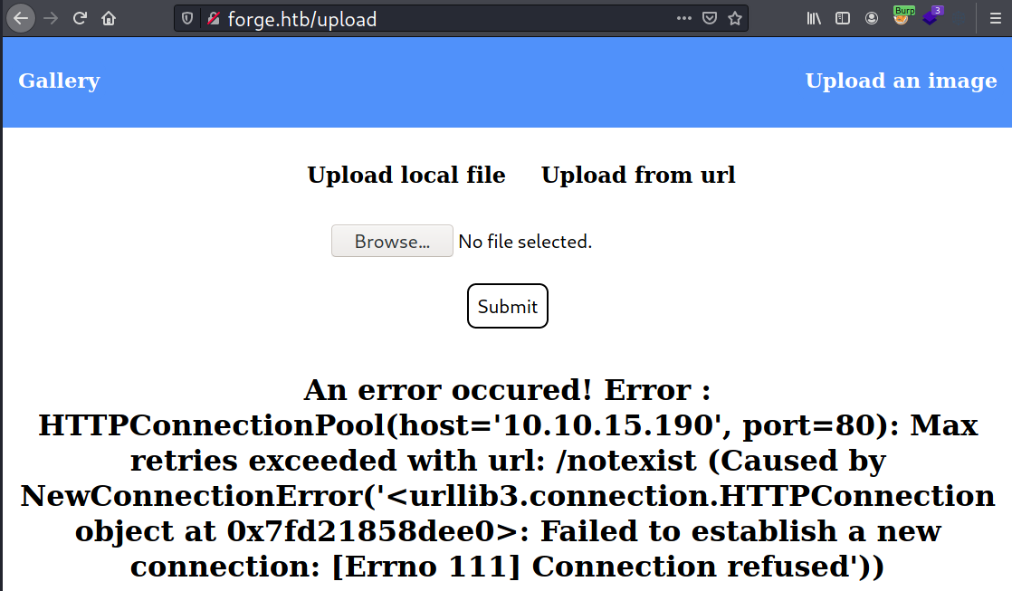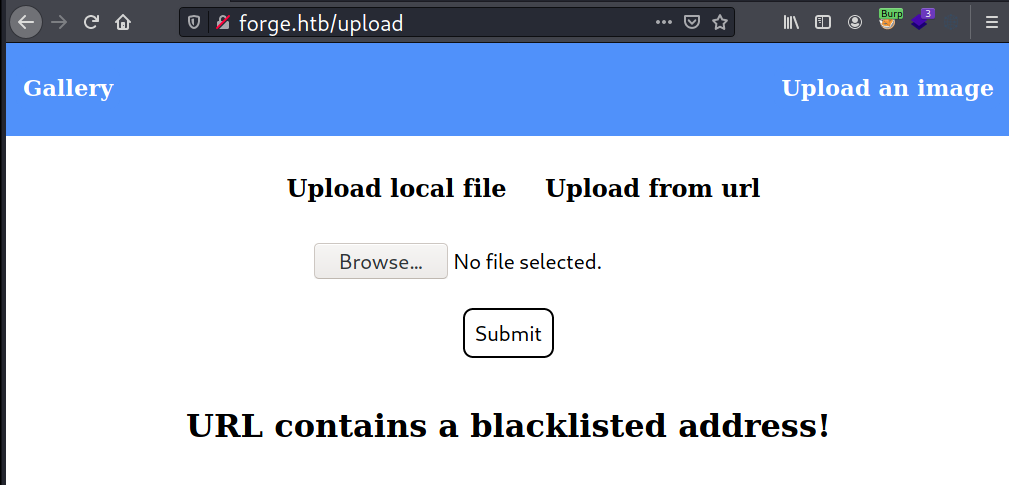 http://admin.forge.htb. - Submit the redirector URL on the upload page at