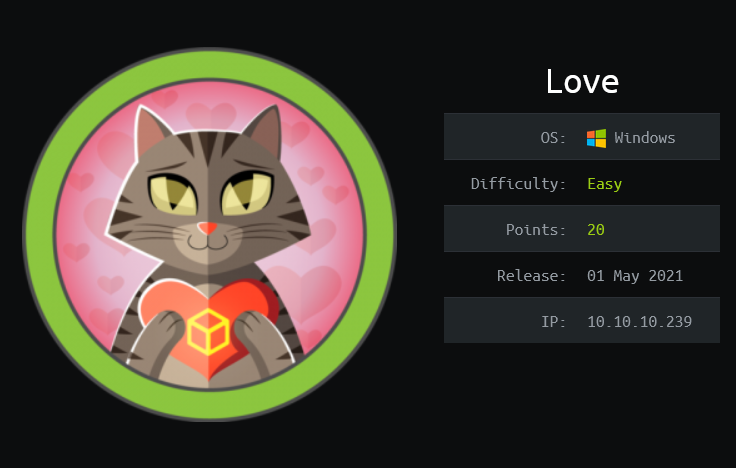 Love from Hack The Box hosts a voting system application and an online file scanner. The file scanner is vulnerable to SSRF, which can be exploited to leak a set of credentials that can be used to login into the voting app. The photo upload functionality can be leveraged to drop a web shell, which is then used to gain interactive shell access on the machine. Enumeration of the system reveals that AlwaysInstallElevated is enabled, and this can be leveraged to install a malicious .msi installer and get SYSTEM access.