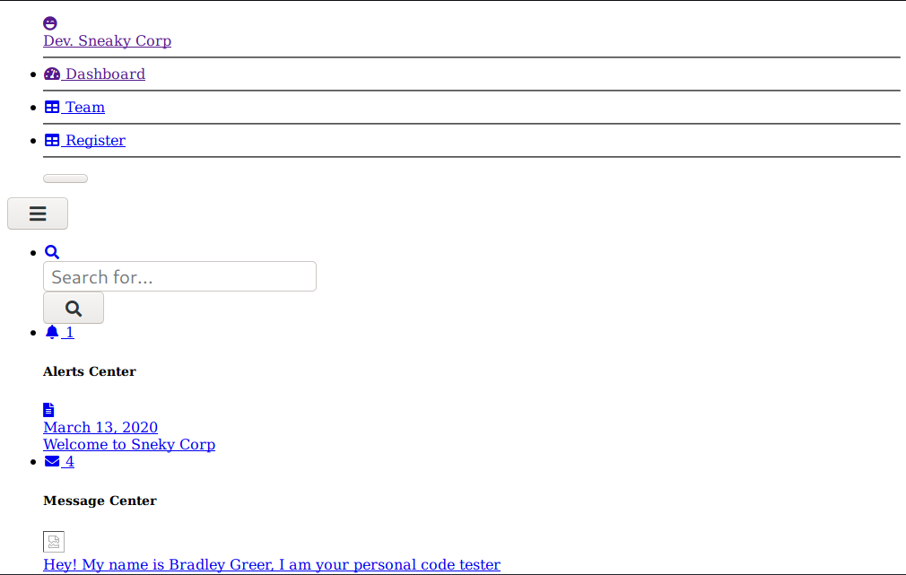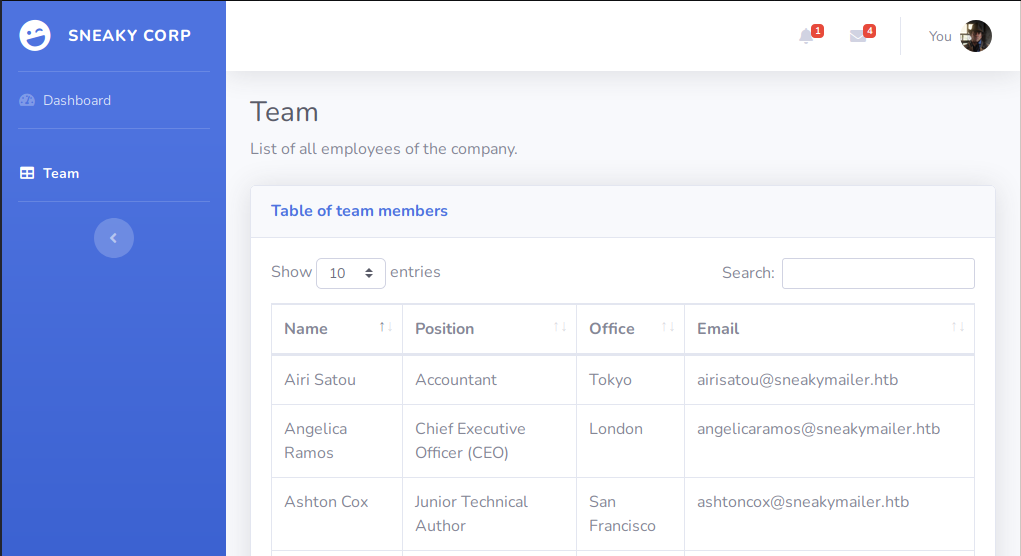 Clicking on the “Team” menu points to/team.php. This page shows a table contains the employees’ data of SneakyCorp.
