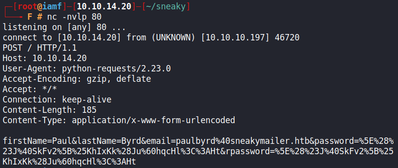 firstName=Paul&lastName=Byrd&email=paulbyrd%40sneakymailer.htb&password=%5E%28%23J%40SkFv2%5B%25KhIxKk%28Ju%60hqcHl%3C%3AHt&rpassword=%5E%28%23J%40SkFv2%5B%25KhIxKk%28Ju%60hqcHl%3C%3AHtIt can be decoded using an online url decoder.
