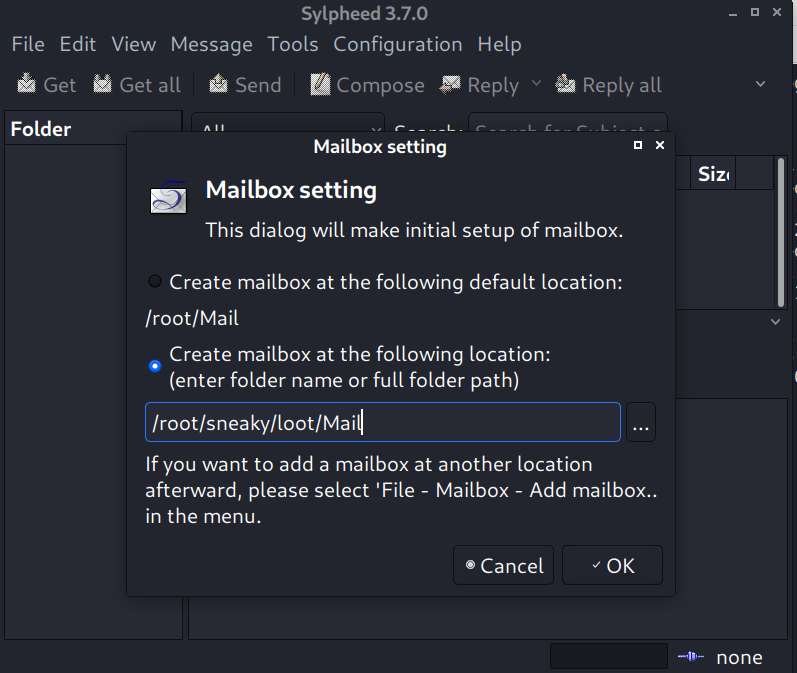 As this is my first install, I’ll have to determine the location of the mailbox (storage) for receiving email from the mail server. I decided to put it on/root/sneaky/loot/Mail.