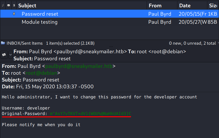 The first email was sent with the subject of “Password Reset”. In this email, Paul asks the administrator to change the developer account password. I’ll grab the credentials of the developer account.