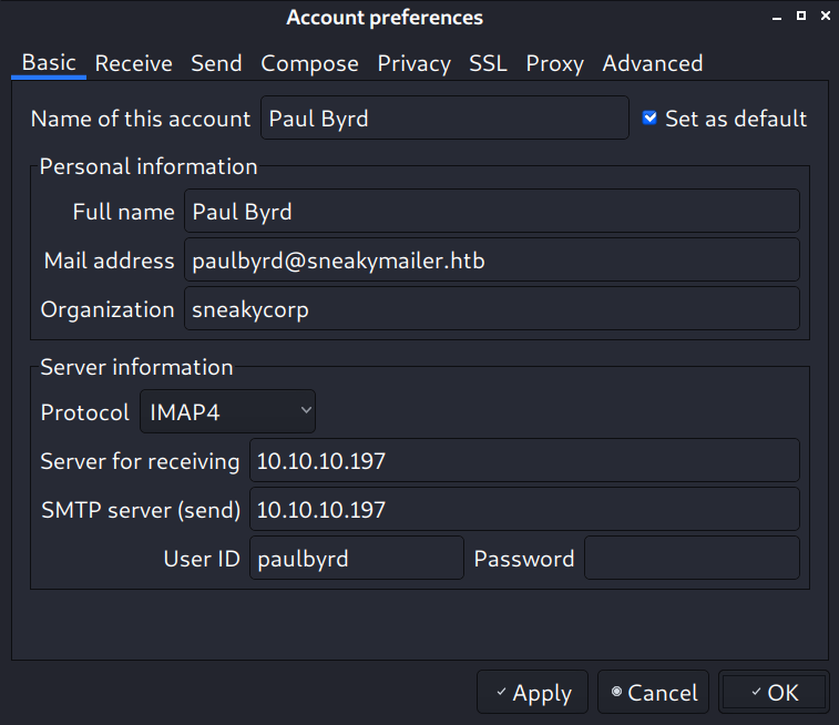With the obtained credentials, I can try to use it on IMAP, but since Kali doesn’t have any builtin mail apps, I’ll need an email client, and I end up with sylpheed. You can install it with sudo apt-get install sylpheed.