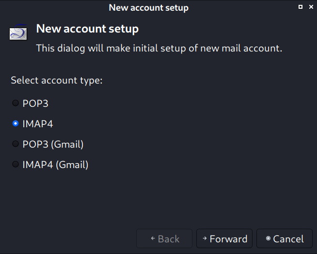 Next I’ll have to determine the account type. Because the box only has IMAP listening and we’re not going outside VPN connection, then I should choose IMAP4.
