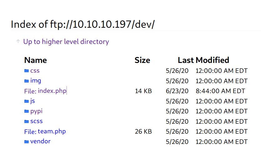 I access the FTP server via browser. The files inside this FTP look the same files as the one hosted on sneakycorp.htb, except it has the additional word “dev” in the title.